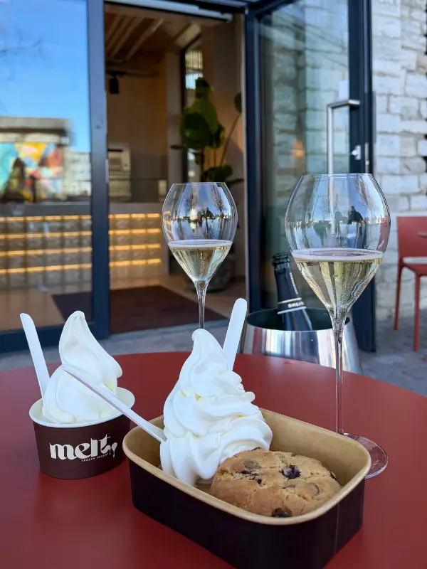 Made with 100% natural ingredients, our froyo is low in sugar, high in protein, and crafted from real yogurt - never powder. Every sauce and topping is made in-house. Alongside froyo, we offer a curated champagne selection by the glass, barista-crafted coffee and matcha, a rotating range of desserts, both warm and cold options, and fresh, satisfying sandwiches during the week.